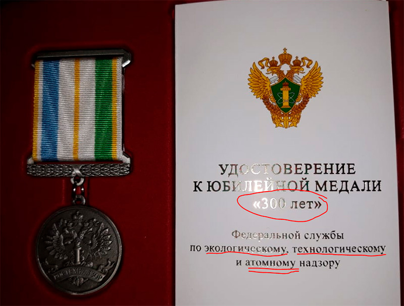 К медали претензии не слишком обоснованы. Да, самому Ростехнадзору всего 15 лет, но его первый предшествиник, Берг-коллегия по горному надзору, была основана Петром I как раз в 1719 году. Естественно, название за 300 лет не раз менялось и, с развитием технологий, надзор за ними тоже расширялся.