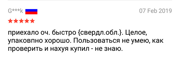 95% отзывов на Али - это "Дошло быстро упаковка целая в работе не ещё проверял продавца рекомендую 5 звёзд!!!111адын"
