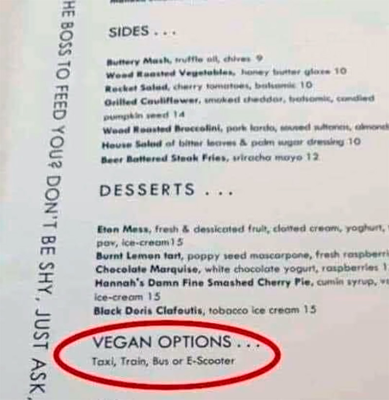 В этом ресторане, рассказала Вика, есть и варианты для веганов: такси, поезд, автобус или электросамокат - и валите отсюда...