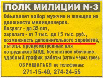 Юлия рекомендует всем поступать в полк милиции. Зарплата, правда, небольшая, но вы же понимаете... В милиции всегда есть возможность, так сказать, дополнительного заработка. Причем они об этом пишут совершенно открыто.