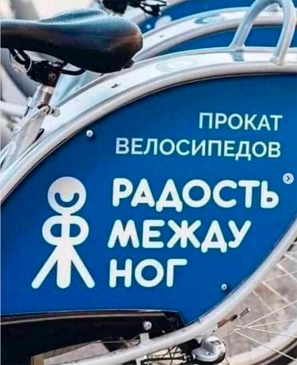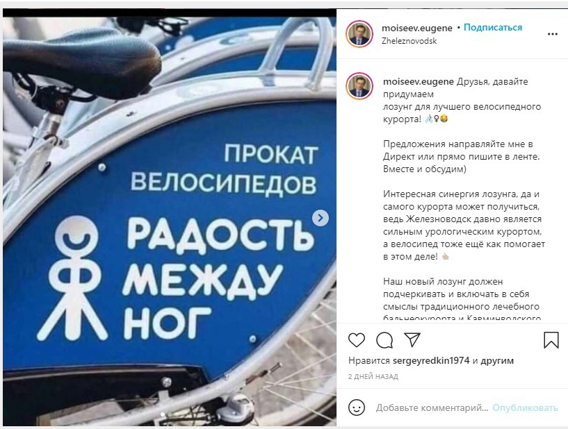 Этот слоган для проката велосипедов придумал мэр Железноводска, рассказал Андрей. А когда взрыв неимоверного креатива мэра стали критиковать, он начал ругаться с комментирующими, потому что если художника может обидеть каждый, то и художник, особенно если он мэр, может обидеть каждого. Большой креативщик мэр Железноводска, большой.