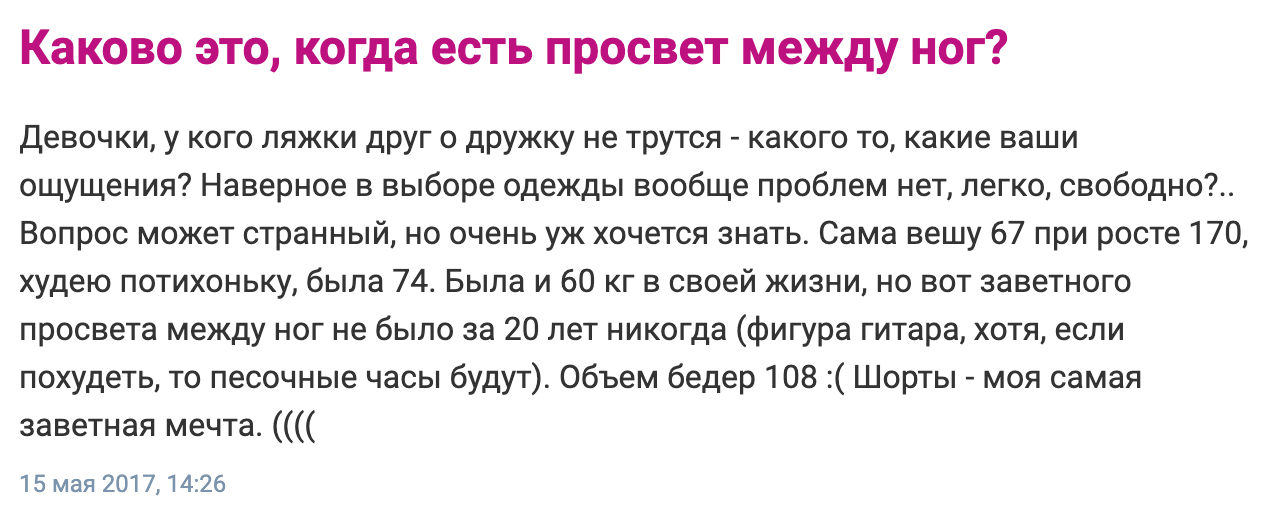 Изображения «Разрыва бедра» теперь изобилуют в социальных сетях, размещенные истощенными девушками, которые тревожно гордятся своей трупной внешностью. Тем не менее, эксперты говорят, что преследование такой неестественной телесной особенности может легко привести к расстройствам пищевого поведения и психическим проблемам. «Большинство женщин не устроены таким образом, чтобы иметь это пространство между бедрами», — сказала клинический психолог Барбара Гринберг.
