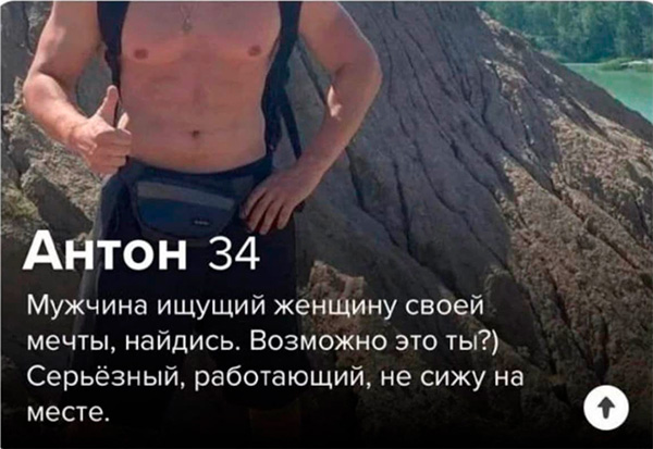 34-летний Антон, объясняет Оксана, ищет другого мужчину, ищущего женщину своей мечты. Они будут искать вместе навстречу своему счастью!.