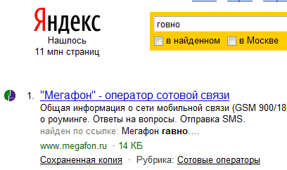 А про "Мегфон"... тож подделка:) ввел я это "говно" в поиск...в первой строчке Мегфона нет)))