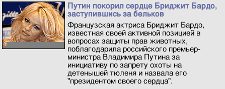 Сердце Бриджит Бардо было настолько покорено, сообщил Владимир, что она даже превратилась в Памелу Андерсон.