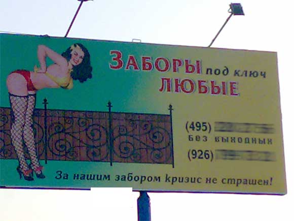 И спросил, что именно тут символизирует эта девка в вызывающей позе. Объясняем. Эта девка вовсе не для того, чтобы водители отвлекались и врезались. Девка символизирует опасность, подстерегающую за забором. Вот поставите забор под ключ - и никакая девка - тем более такая вульгарная, просто мечта дальнобойщика - к вам на участок уже не запрыгнет. Красота!