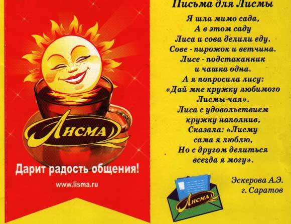 Да-да, покупал я Лисму как-то (самый дешевый чай, пакетик дешевле рубля выходил), находил такие стишки. Ужас. Школьник написать сможет лучше.