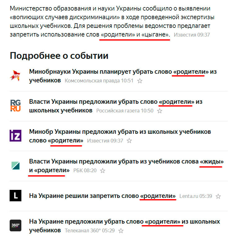 И только "РБК", замечает Елена, как-то очень по-своему интерпретировала новость о запрете слов "родители" и "цыгане" в учебниках.