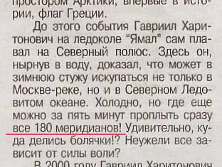 И действительно, ведь меридианов у нас все 360, а не 180. Но, может, Гаврюша просто не умеет считать? Хотя нет, вряд ли. Когда он был московским градоначальником, считать мужик явно умел как полагается. В сторону соответствующего, разумеется, кармана.