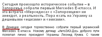 Объясняю. Собрали в Запорожье. Отправили его своим ходом в Донецк. Он туда додымил и развалился. но там его торжественно собрали и представили Кучме. Тот сказал: "Доброго пути!", на что "Мерседес" ответил, кряхтя: "Спасибо. Сам не развались!"
