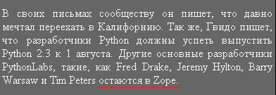 Нелегко приходится разработчикам из PythonLabs, сообщает Дмитрий. Одни из них мечтают переехать в Калифорнию, а другие остаются...