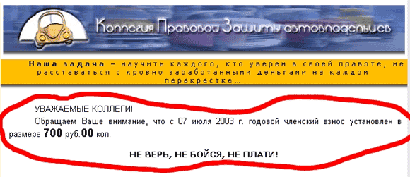 Вадима радует Коллегия правовой защиты автовладельцев. Они одной рукой собирают членские взносы, а другой - своим же баннером объясняют, что делать с этими взносами: