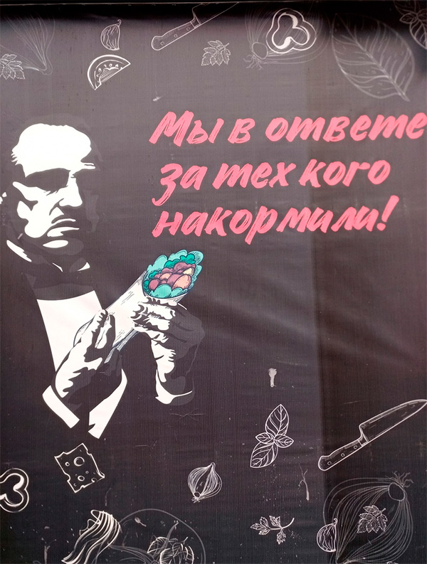 Мират прислал вот такое шаурмячное творчество. Несколько странноватое. Вообще, по логике вещей, в этой шаурме должна быть мертвая рыба. Ведь это старинный сицилийский обычай. Ну и, конечно, лозунг должен звучать так: "Они еще ответят за то, что мы их накормили".