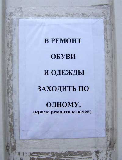 Александр прислал очень важное предупреждение. Если у вас ремонт обуви или одежды - заходите по одному. Если в ремонт ключей - можете ломануться целой толпой, полностью игнорируя ремонт обуви и одежды. Смотрите свысока на этих придурков, которым ремонтировать обувь и одежду!