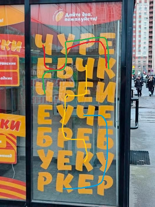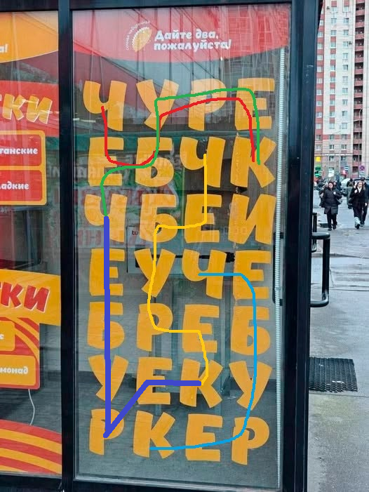 Посмотрите, если начинать с любой буквы Ч и двигаться только по вертикали и горизонтали, всегда можно составить слово ЧЕБУРЕК.