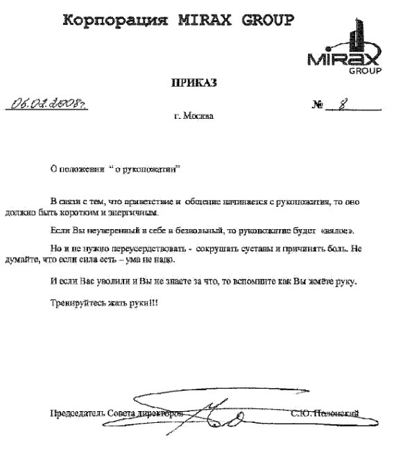 В корпорации Mirax Group, рассказал Вася Пупкин, выпускают очень интересные приказы. Вероятно, скоро аналогичные приказы будут выпущены на тему бритья подмышек, использования цвета белья и прочих деликатесов.