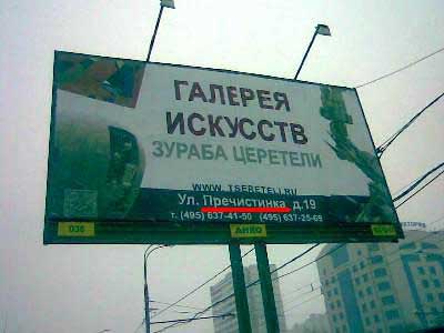 Великий русский художник Зураб Церетели, рассказала Jane Elliott, вот уже много месяцев зазывает в свою галерею с помощью крутых плакатов. Правда, на плакатах там указана какая-то ПречистИнка, которой в природе не существует, однако до подобных ли мелочей такому титанику мысли и форм?!!