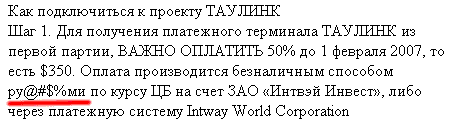 В проекте "Таулинк" настолько заботятся о нашей нравственности, что даже не нашли в себе силы написать слово "рублями" - а то вдруг примут за матерное, рассказал Capybarra.