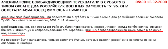 В этом инциденте все отличились, радуется Алексей. Российские бомбардировщики отправились в разведовательный полет и конкретно зависли над авианосцем - как аист над гнездом. А встревоженные американы отправили на перехват шустрых бомбардировщиков... - тоже бомбардировщики! Это как симметричный ответ: вы нам бомбардировщики, мы вам - бомбардировщики!