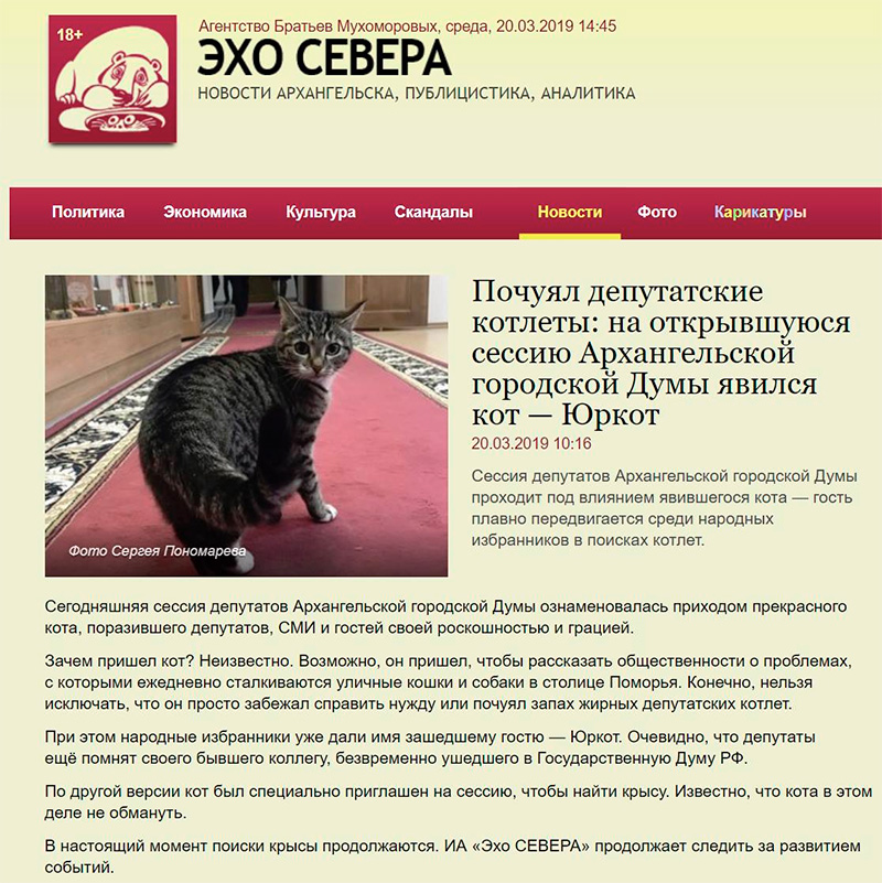 Сначала подумал, что статья про кота из какого-то юмористического сайта, надпись "Агентство Братьев Мухоморовых" в шапке как бы намекает. Но нет, зашел туда - вполне обычный региональный новостной сайт.