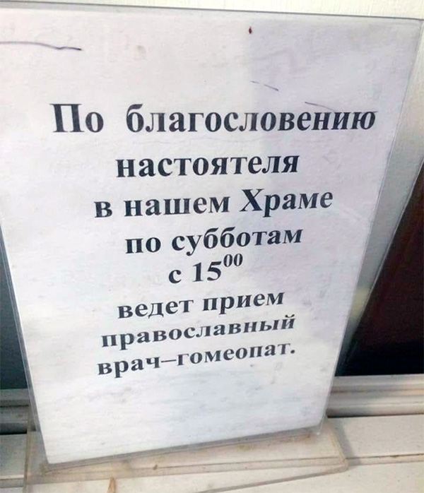 У православного врача-гомеопата, замечает Алексей, и разведения прямо-таки благостные. Однако до кучи не хватает православного астролога и православного экстрасенса.