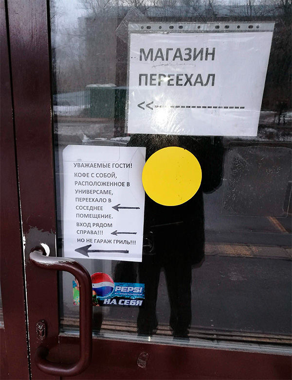 Алексей прислал несколько психоделическое объявление о кофе, которое переехало в соседнее помещение. Вход справа. Причем стрелки указывают налево. И это не гараж гриль. В общем, загадочная история.