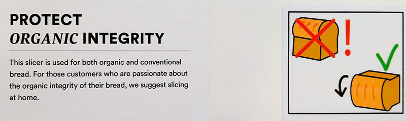 Сергей нам прислал табличку c хлеборезки в магазине сети Whole Foods Market в пригороде Денвера. Там людям, сдвинутым на "органике", объясняют, что данная хлеборезка обслуживает и органический, и неорганический хлеб, поэтому если вы не хотите, чтобы вашей органики коснулся нож, оскверненный неорганикой, то тогда режьте сами дома.