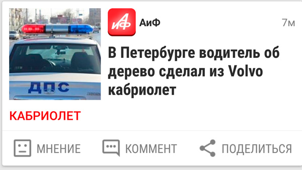 Заголовки в СМИ, считает Zero Witch, становятся все дебильнее и дебильнее. "Водитель об дерево". Об - это глагол, что ли? Ну зато хоть иллюстрация в тему. Тут тебе и Volvo, и дерево, и кабриолет...