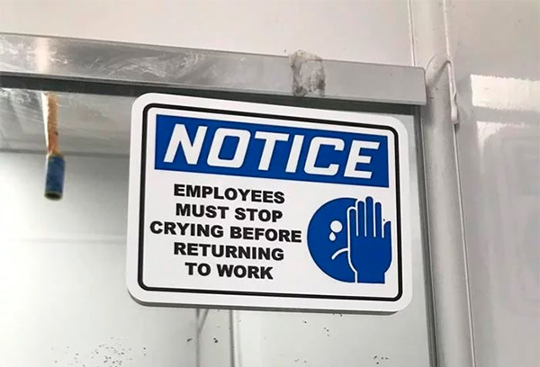 А вот тут прям интересно выяснить, что это за работа такая. (Надпись: "Работники должны перестать плакать, прежде чем вернуться к работе".)