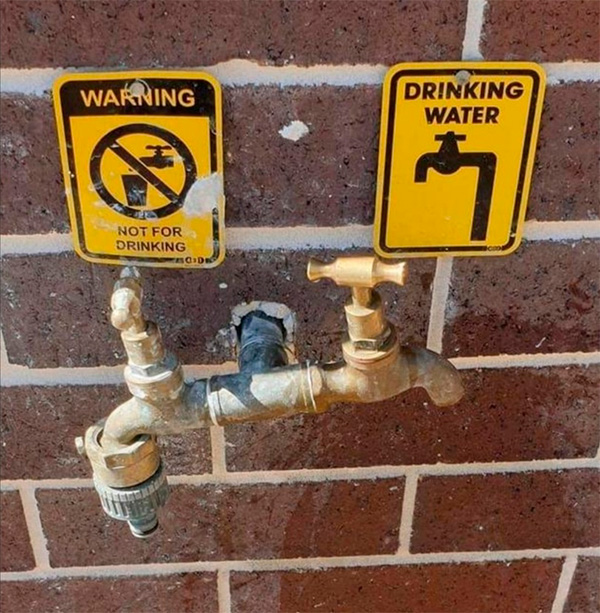 Тут главное - не перепутать! Потому что это смертельно опасно! (Слева надпись "Внимание, не для питья", справа надпись "Питьевая вода".)