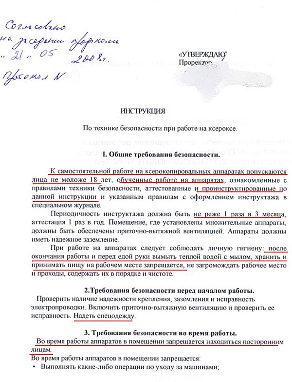 Инструкцией по пользованию копировальной машиной не удивлен. Требования составления инструкций на все и вся действительно есть, а так как выдумывать что-то осмысленное лень, то вход идет излюбленный народно-мастеровой метода "copy + paste". Доходило и не до таких абсурдов, например у нас существует утвержденная инструкция №46 "по охране труда работников ГЦТ, принимающих непосредственное участие в процессе движении в качестве пешехода, пассажира транспортного средства, при перемещение с одного производственного объекта на другой, а также при движении на работу и с работы"