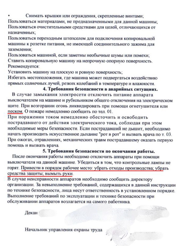 Владимир прислал совершенно психоделическую бумажку с инструкцией по технике безопасности при работе на копировальной машине.