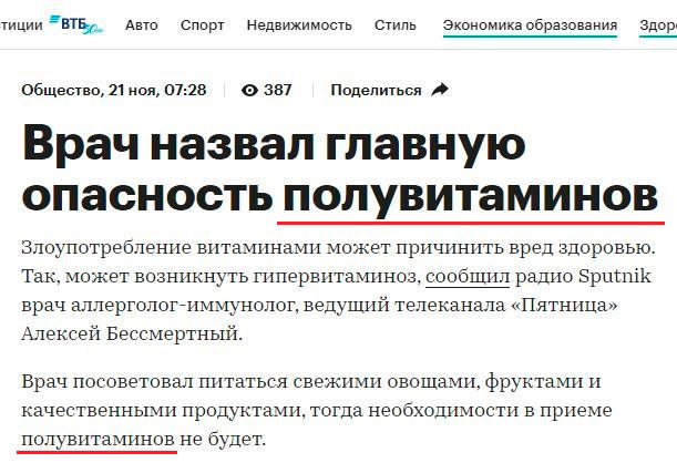 На "РБК", пугает Петр, рассказали о страшной опасности полувитаминов. И тут, конечно, все логично: полувитамины наверняка опаснее обычных витаминов, потому что черт его знает, что туда напихали в качестве половины витаминов!