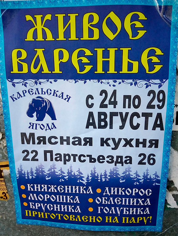 "Ягоды для этого варенья собирал карельский медведь - он и изображен на плакате. Поэтому на мясной кухне, потому что злые люди подстерегли медведя, застрелили его и отобрали у него ягоду. А живое это варенье, потому что открываешь банку, а оно ка-а-а-ак прыгнет..."