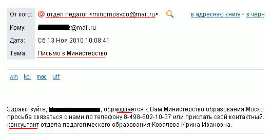 Анониму прислали вот такое вот письмо из Министерства образования. От консуьтанта отдела педагогического образования. Они педагогов образовывают.