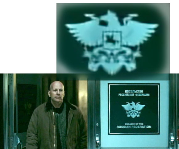 В фильме "РЭД", рассказал Nick, очень забавный герб на вывеске посольства. Во-первых, он одноглавый - одна из голов тандема куда-то потерялась. Во-вторых, он беременный всадником на коне. Видать, Юрием Долгоруким. Неудивительно, что у Брюса такое удивленное выражение на лице.