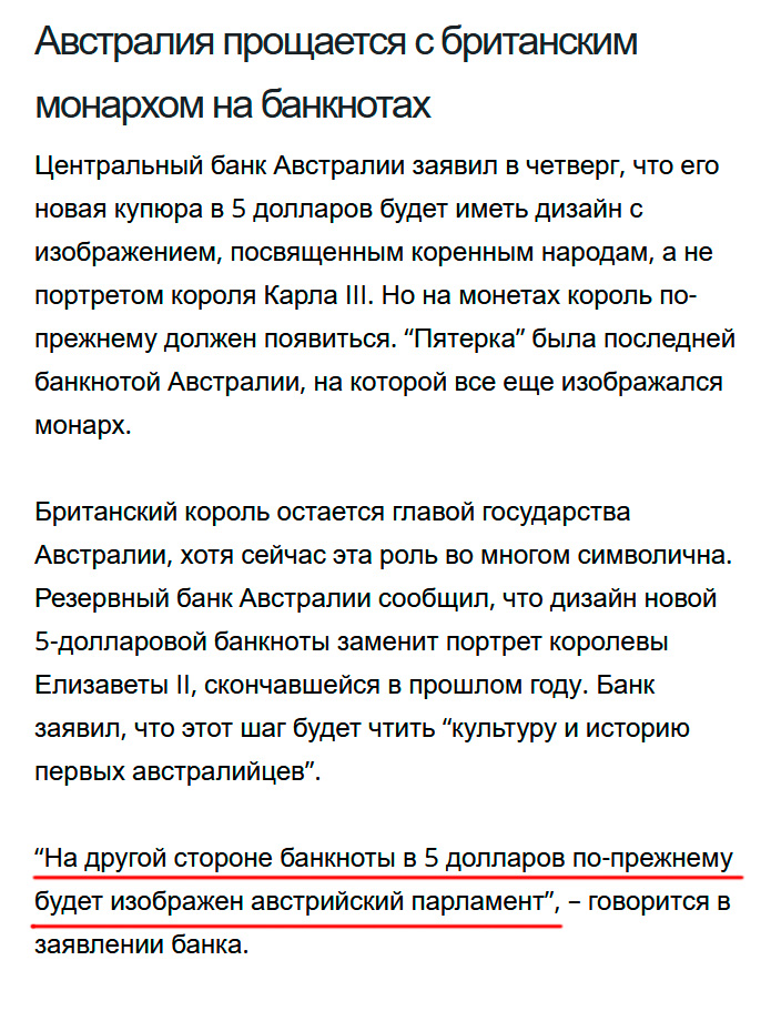 Австралия прощается с британским монархом на банкнотах, рассказал Вадим, но зато австрийский парламент они не будут убирать. Потому что австрийский парламент - давний побратим австралийского парламента.
