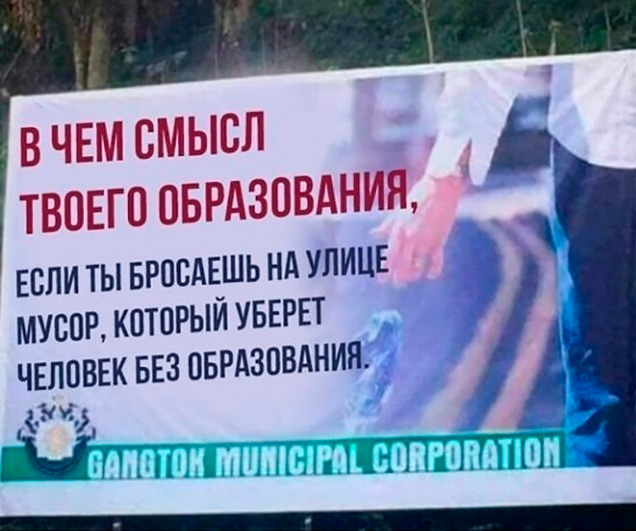 Какая потрясающая социальная реклама! Смысл моего образования - в том, что я могу бросить на улице мусор, который вместо меня уберет человек без образования. Что вроде бы очевидно.