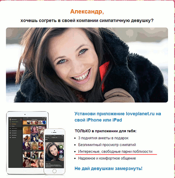 Александру Loveplanet предложила согреть симпатичную девушку. Ну и заодно поискать свободных парней поблизости - до кучи. Чтобы уж всем скопом разогреть девушку.