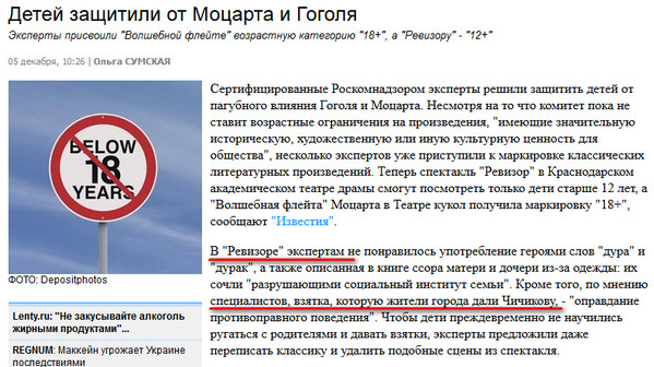 Вот такие вот эксперты-специалисты запрещают детям смотреть классические спектакли, вздыхает Сергей. Чичиков у них в "Ревизоре". А что не Иван Федорович Крузенштерн?!!