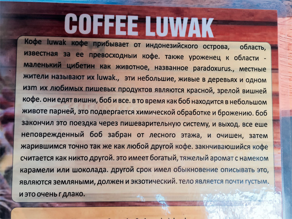 Ирина восхищается русским текстом на Бали - там рекламируют кофе, сделанный из кофейных бобов, выкаканных маленькими цибетинами как животными. Самый дорогой кофе в мире, кстати.