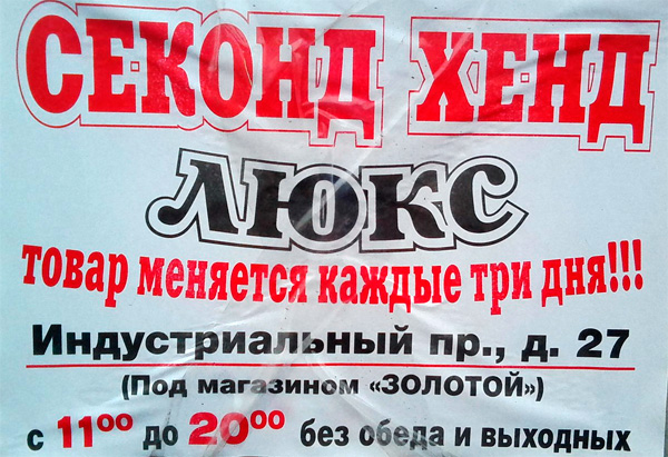 "Секонд-хенд люкс" - также вполне объяснимо. Ну, знаете, мало ли всяких монархов отцарствовались. Куда девать все эти собольи шубы, шапки Мономаха, скипетры и прочее царское барахлишко? А в обычный секонд-хенд как-то не по чину. Вот и сделали специально для них - как раз под магазином "Золотой".