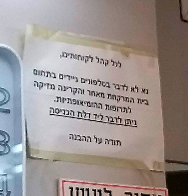 Елена прислала из Израиля неимоверно прекрасное объявление в аптеке. Надпись: "Пожалуйста не говорите по мобильному телефону в аптеке, поскольку излучение вредит гомеопатическим лекарствам".