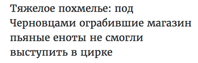 Про енотов, кстати, правда. Из проезжего шапито сбежало несколько енотов, через дыру в крыше забрались в магазин, грохнули несколько бутылок со спиртным, и, после употребления содержимого, практически разнесли торговую точку.
