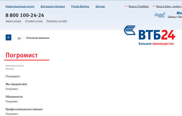 В отдел нанотехнологий банка "ВТБ24", рассказал Макс, требуется погромист. Имеющий хороший опыт погромизма.