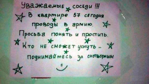 у меня просто четкие воспоминания именно на эту тему. в 91 году над нами происходил беспредел, и маман пошла им стучать в дверь. Мужик вышел, сказал "я сына в армию провожаю". Маман вернулась и сказала, что, да, право имеют. Панчлайн: через полгода сына привезли на носилках и он в госпитале полгода лежал. На острове Русский служил, Отец как-то его сумел оттуда забрать. А в соседнем доме чувака на год меня старше в цинковом гробу привезли. В Чечне служил. Военная кафедра наше все.