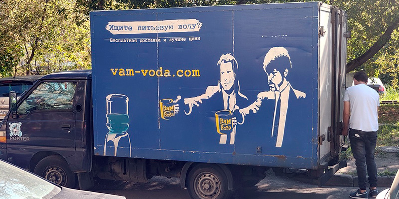 Винсент и Джулс, вздыхает Гена Крокодил, рекламируют питьевую воду. Да еще и с безграмотным заголовком. Зря они все-таки не взяли с собой дробовик.