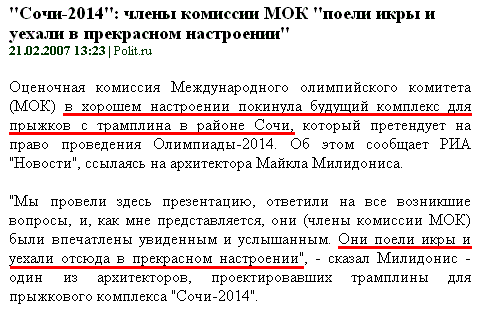 Какое счастье, замечает Triangle, что наши все делают по уму. Встретили оценочную комиссию, показали неработающий аэропорт под видом работающего, с песнями и плясками отвезли в горы, там напоили водкой. А когда оценочная комиссия заплетающимся языком спросила: "А где трамплины-то?" - им заткнули рот икрой. И тогда комиссия уехала вполне довольная. Правда, с головной болью.