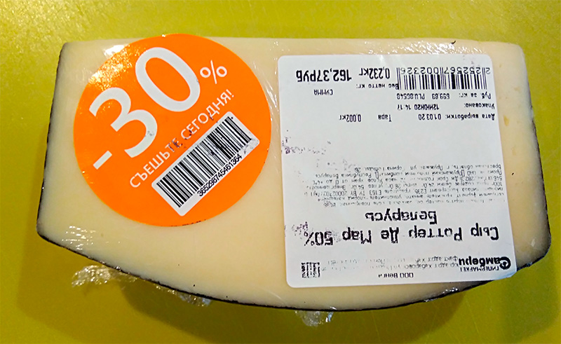 Ну, очевидно, что "-30%" может означать только то, что тебе дали на тридцать процентов меньше за те же деньги. А "съешьте сегодня" означает, что сыр уже просроченный. Интересное, короче говоря, маркетинговое предложение.