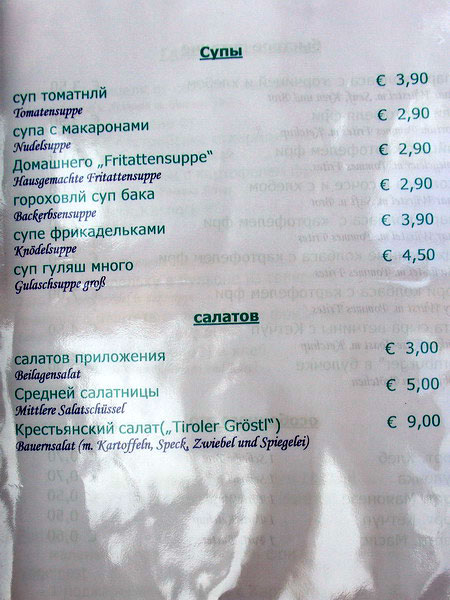 Виктор прислал чудеснейшее меню горных отморозков (Австрия). На русском.